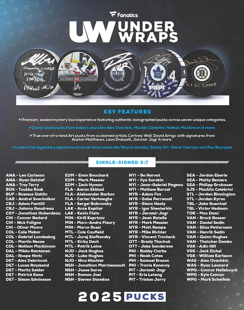 Hockey fans, it’s time to drop the puck. The 2025 Under Wraps NHL Puck mystery box is loaded and built for collectors who crave the thrill of the unknown. Crack open the box and reveal a legit, officially licensed, autographed puck from one of the game’s biggest names or legendary icons. Find autographed game-used pucks from Alexander Ovechkin, Nathan MacKinnon, Macklin Celebrini, Cale Makar, Igor Shesterkin, Cole Caufield & more! Under Wraps is perfect for serious collectors and new collectors by giving an opportunity at unwrapping some of the biggest names in hockey, past & present!